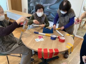 体操の前に、新聞紙で体操に使用する棒を作成しました。