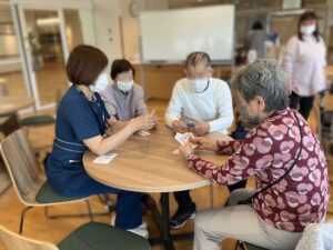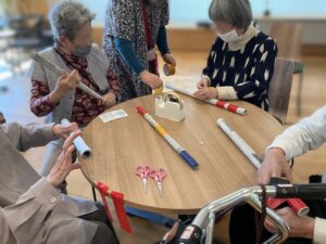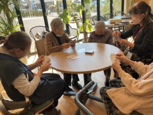 体操の後は春のお茶会をしながら、トランプや貝合わせを楽しみました。